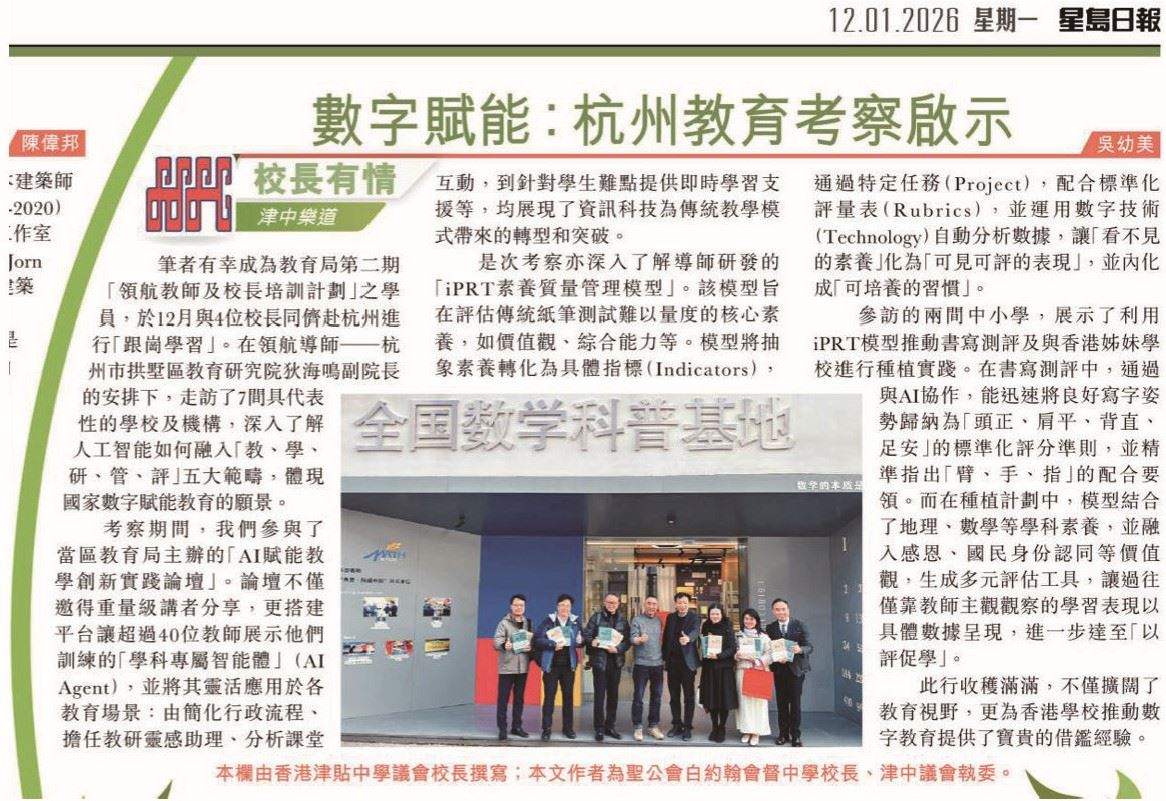Principal Ng Yau-mei, Shirley was recently invited to contribute to the education column in Sing Tao Daily. In her article, titled "Digital Empowerment – Insights from the Hangzhou Educational Study Tour," she shares observations and experiences from her recent visit to Hangzhou.