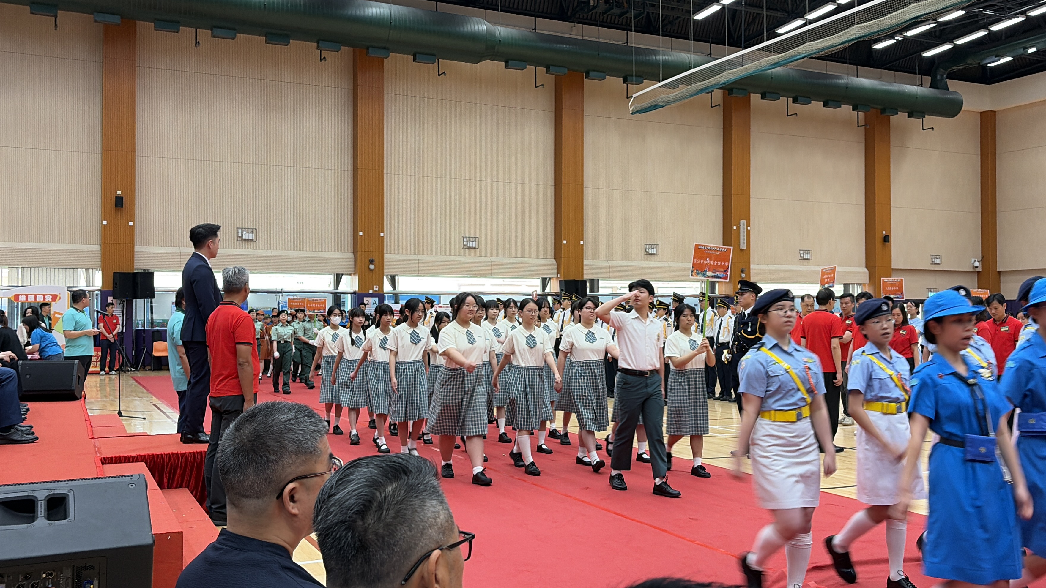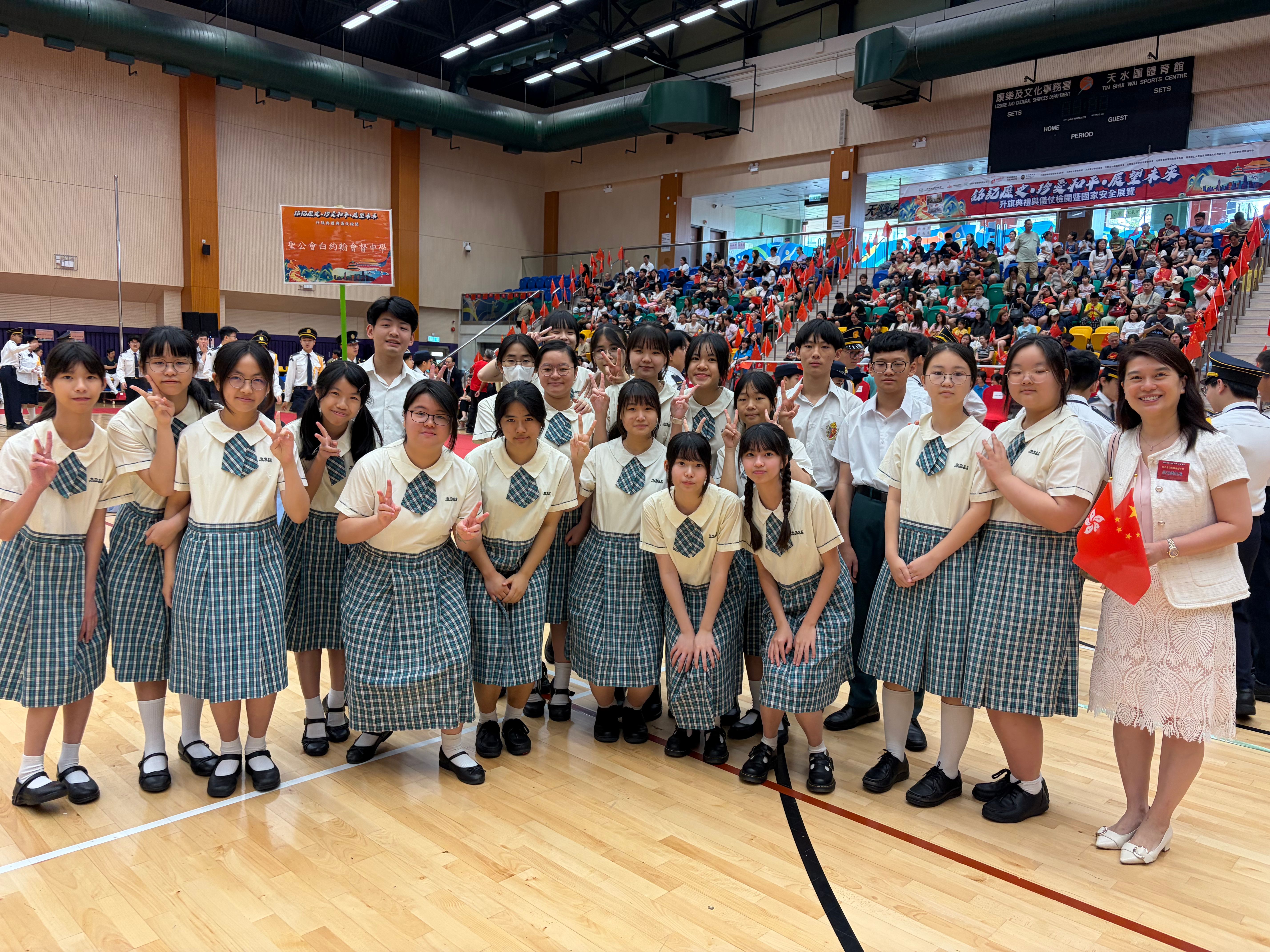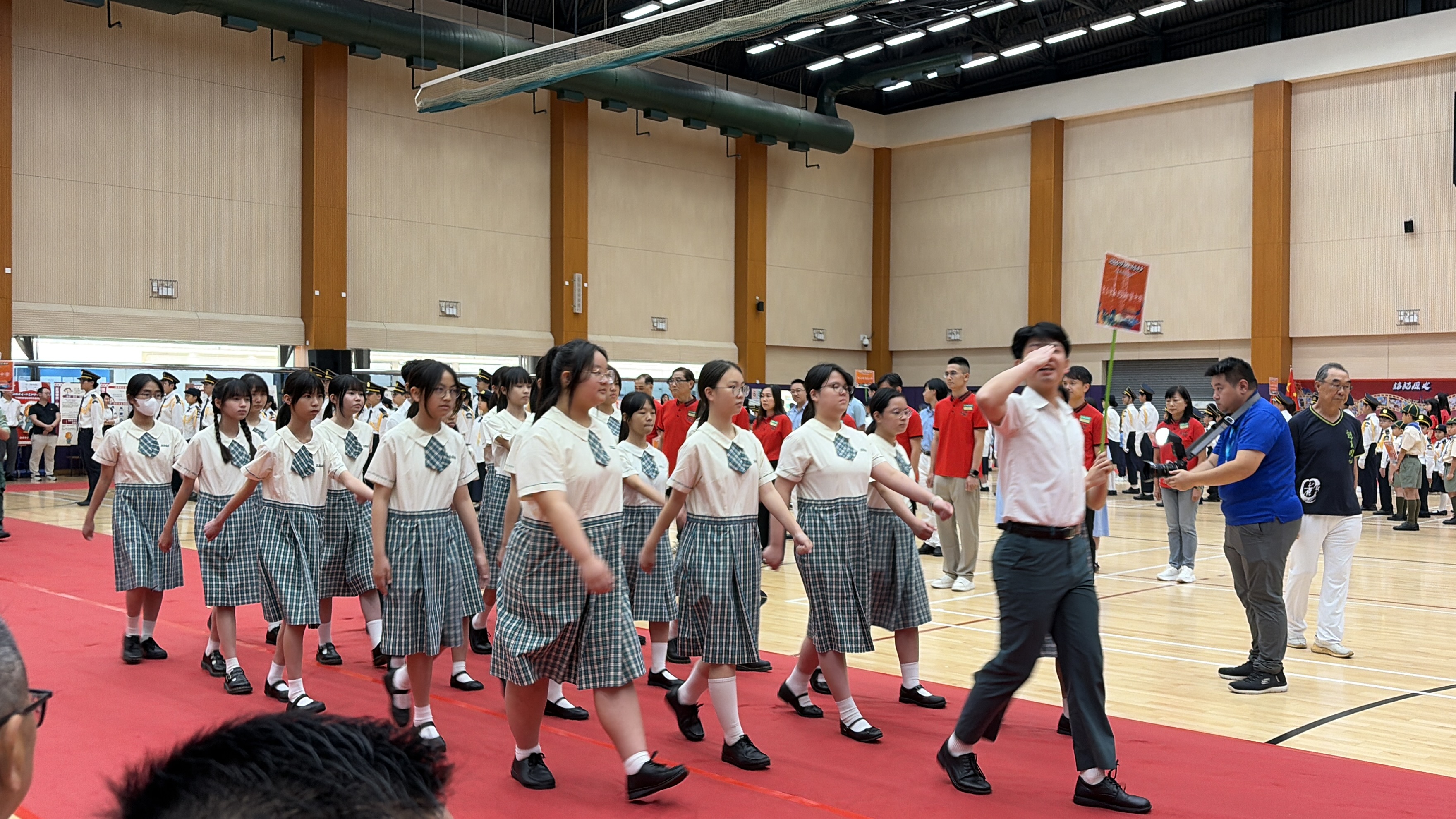 The ceremony was majestic. As the national anthem played and the Five-star Red Flag rose, the entire audience stood in solemn attention, and a strong sense of pride and mission filled the hearts of our teachers and students. Under the review of the Inspecting Officer, Mr. Ma Fu-wai, Kelvin, JP, District Officer (Yuen Long), our team members, dressed in neat uniforms, demonstrated rigorous discipline and a vibrant spirit with their firm and powerful steps, fully embodying the sense of belonging of our students to our nation.